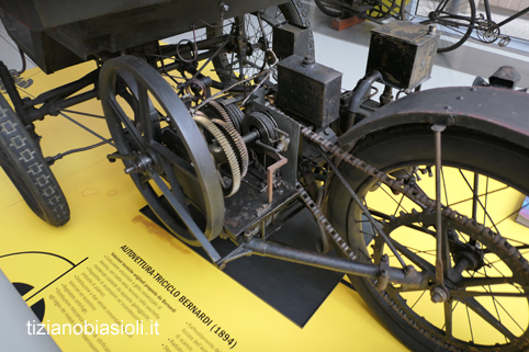 La prima vettura ha solo tre ruote; in effetti è un triciclo, progetto del veronese Enrico Bernardi (1841-1919), professore in Macchine Idrauliche, Termiche ed Agricole all’Università di Padova.